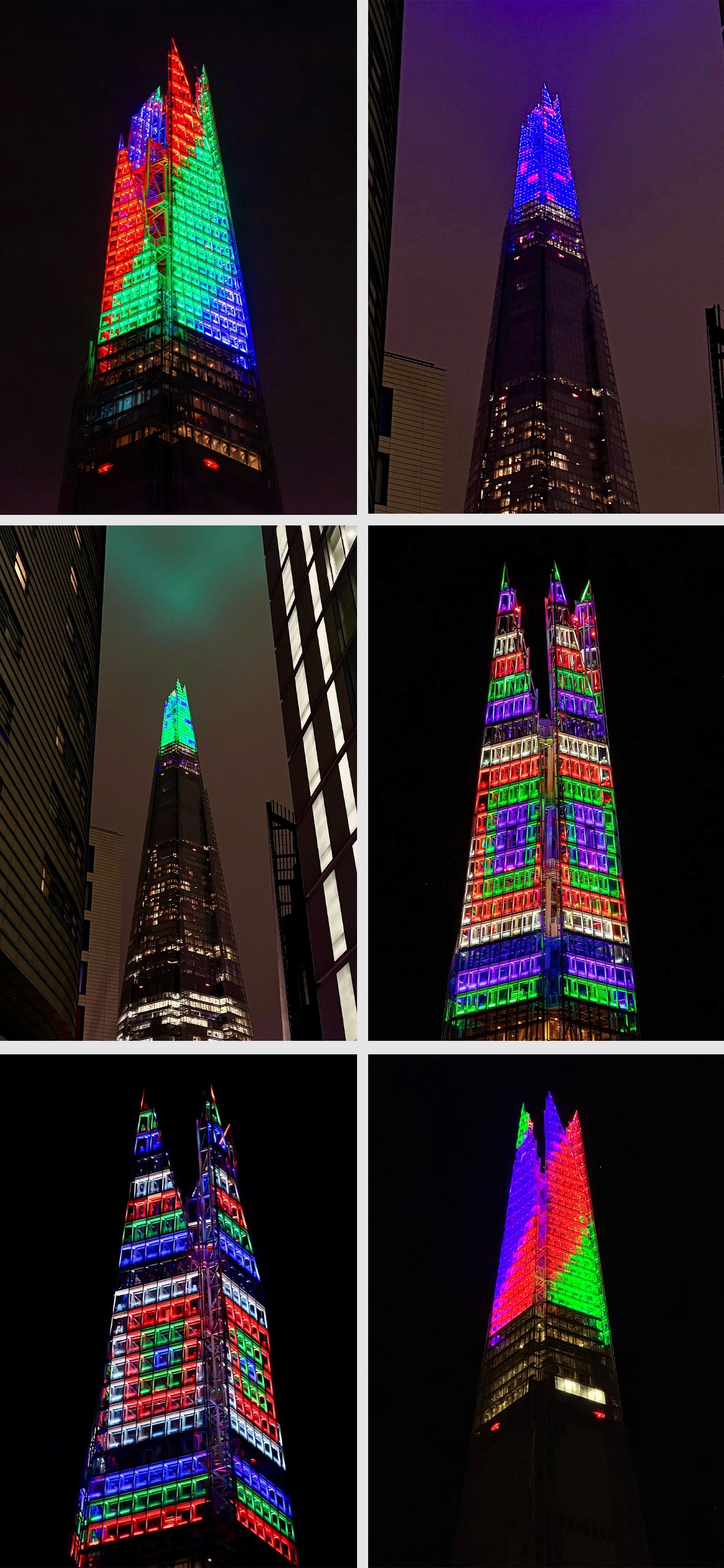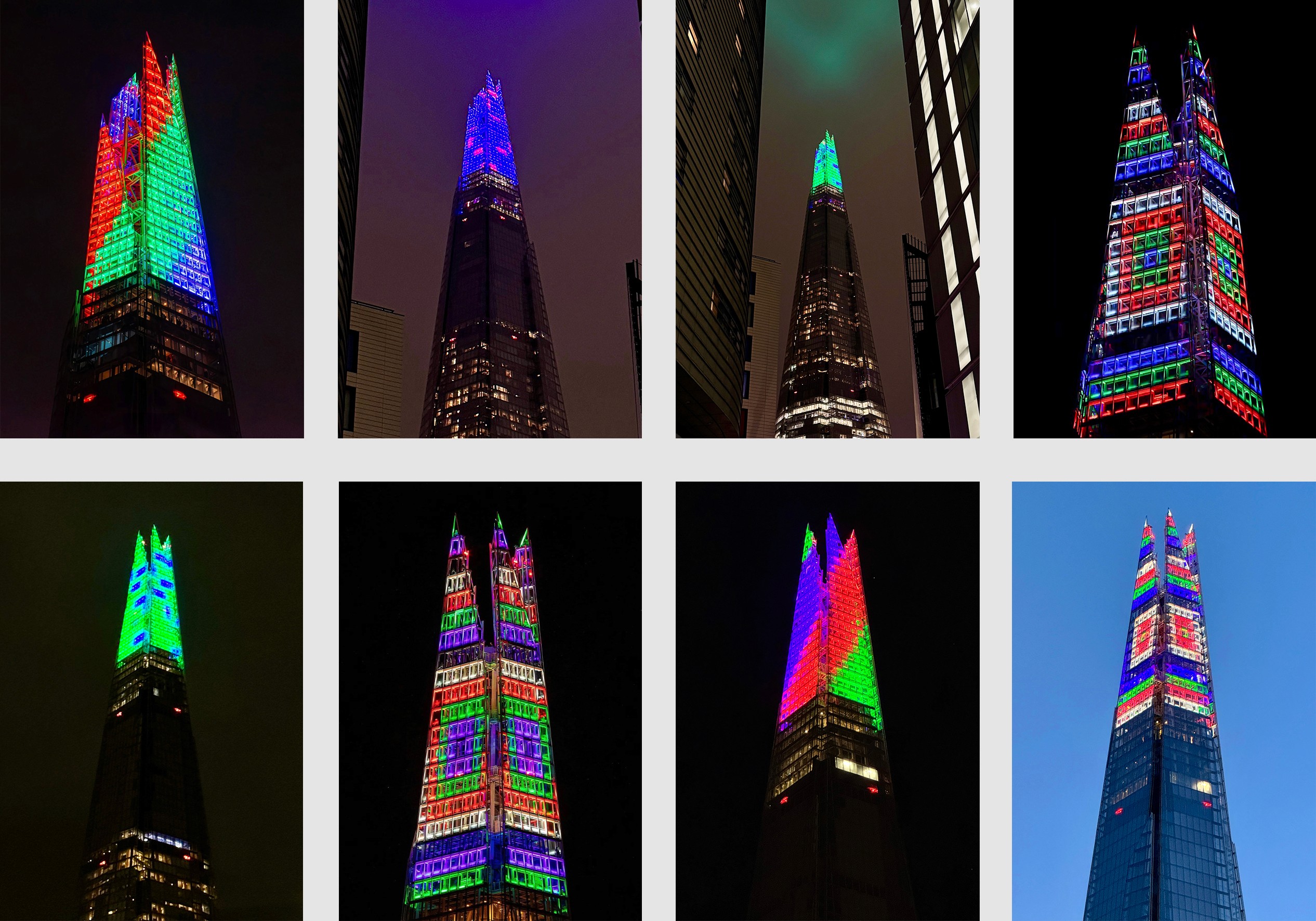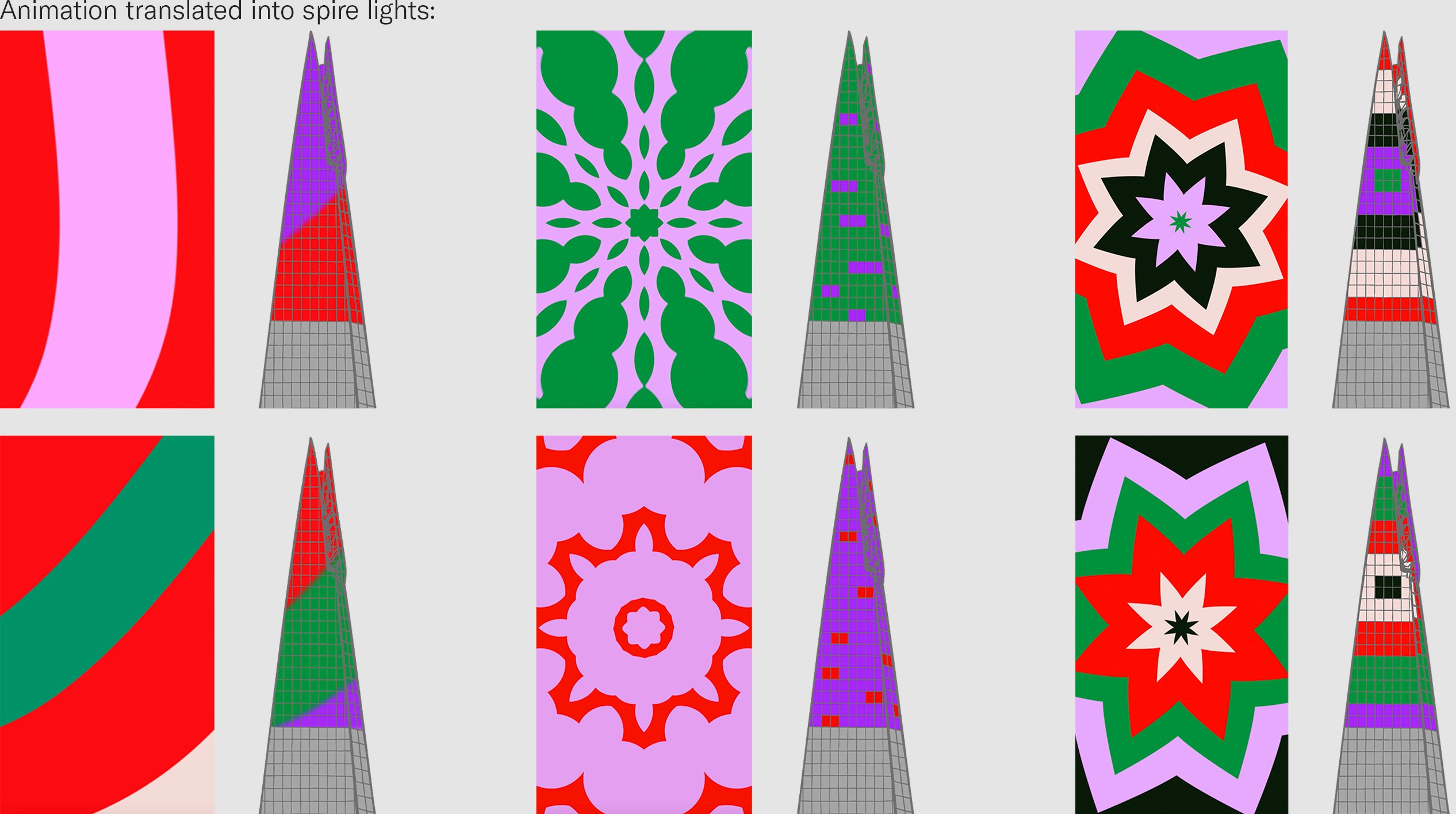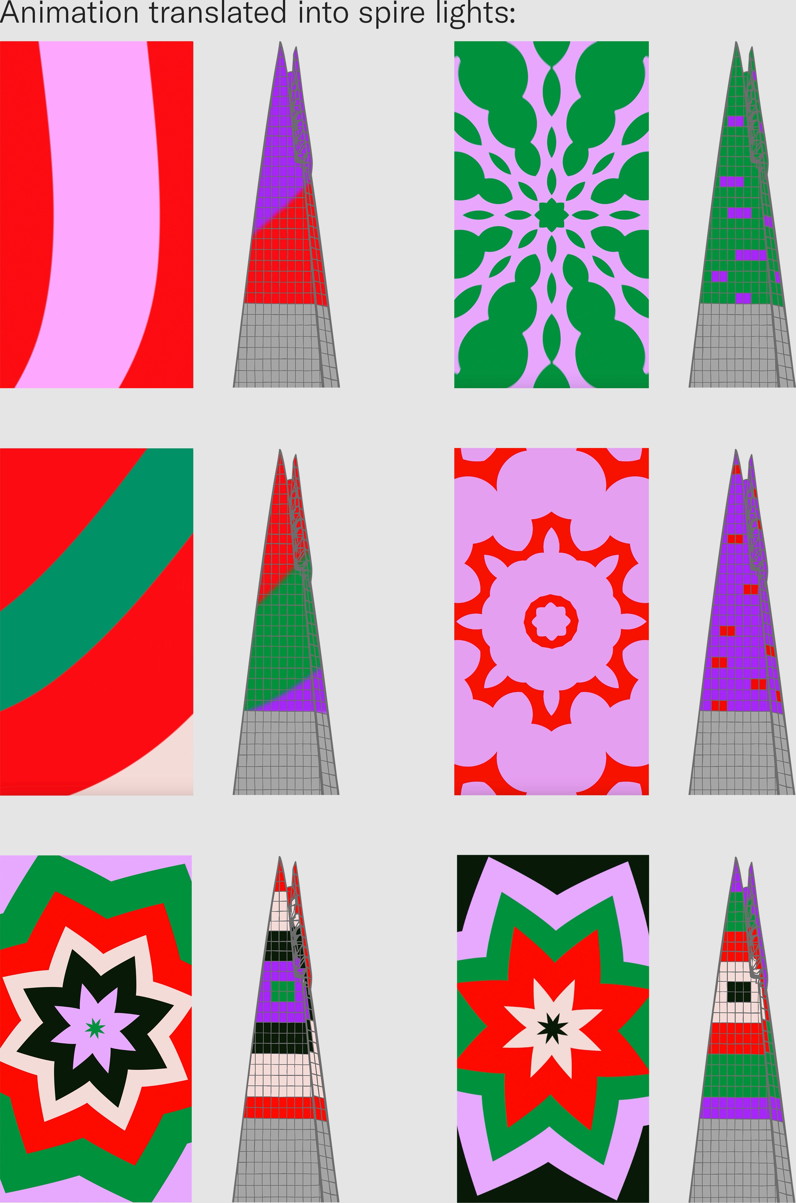 I worked with lighting designers to translate the concept onto the Shard’s spire, developing detailed mock-ups to test how it would read at height and distance. The colour palette was then refined to increase contrast and visibility, ensuring the final sequence felt striking and legible across the skyline.
